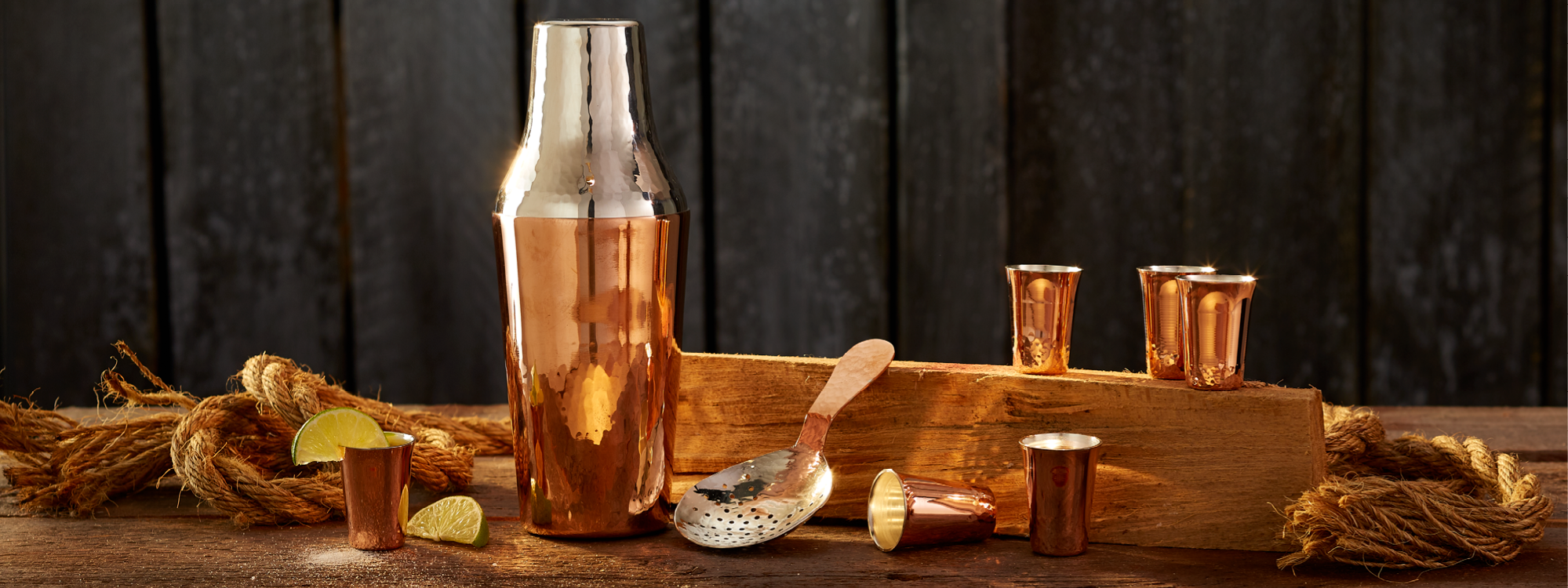 Made from only the highest quality PURE .999 COPPER. Our top copper line is hand forged, hammered and PURE .999 SILVER lined. Silver, bronze and stainless are incorporated to some products bringing them to the next level in barware. The quality speaks for itself from the hand riveted handles to the hammered texture that makes each and every product one of a kind.